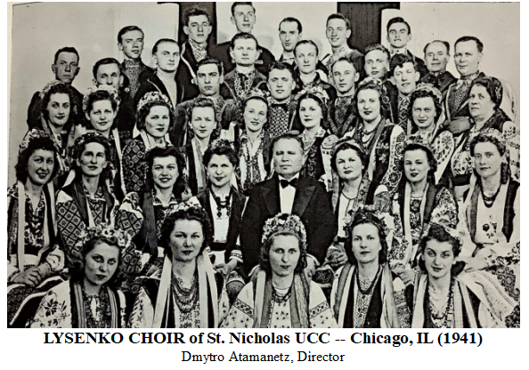 Dmytro Atamanetz [Дмитро Атаманець], (b. 1882 in Nyzhchi Lubyanka, Ternopil, Ukraine; d. 1976 in Wayne, MI). Singer, choir director, Ukrainian School teacher, and church figure in Michigan and Illinois. He received three years of training in church music at a school for cantors in Stanislaviv (now Ivano-Frankivsk). Upon his arrival in America in 1913, he settled in Detroit, where he directed the choir at St. John the Baptist Ukrainian Catholic Church (1913-1916), and afterwards at Immaculate Conception Ukrainian Catholic Church in Hamtramck, MI. He moved to Chicago in 1921 to become the choirmaster at St. Nicholas. There he spent the next 25 years conducting the cathedral choir and teaching classes at the Ukrainian School. Around 1945, he returned to his former position in Hamtramck as choir director of Immaculate Conception. Professor Atamanetz retired in 1952 and passed away in 1976 in the Detroit suburb of Wayne, MI.