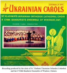 Eugene Ciura [Євген Цюрa], (b. 1915 in Radomyshl, Volyn, Zhytomyr oblast; d. March 13, 2001, in Windsor, ON). Bandurist and church choir director at St. Vladimir Ukrainian Orthodox Cathedral in Windsor, Ontario, from 1966 to 1996. Having entered the Kyiv Conservatory of Music to study conducting and singing, he also developed an interest in learning to play the bandura. In 1942, he became a leading member of the official State Ukrainian Bandurist Capella, later renamed the Ukrainian Bandurist Chorus. He came with the chorus to America in 1949 to begin a new life in the Detroit area. During his time as choir director at St. Vladimir Cathedral, he formed a large bandura ensemble made up of his students. The ensemble performed extensively and made recordings. Ciura passed away in 2001 and is buried at Windsor Memorial Gardens.