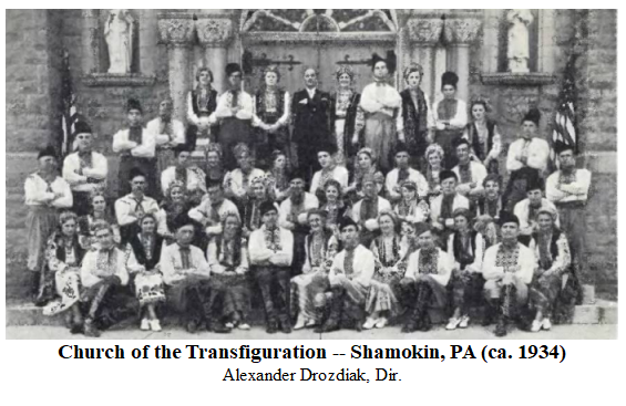 Alexander Drozdiak [Олександр Дроздяк], (b. Dec. 1, 1885, in Koroleva Ruska [Королева Руська]; d. March 14, 1947, in Shamokin, Pennsylvania). He studied music at two conservatories in Austria-Hungary: the Nowy Sącz Academy and the Pryzemysl School. He came to the U.S. in 1909 and settled in Mount Carmel, Pennsylvania, where he was hired as the cantor and teacher at SS. Peter and Paul Church (1911-1913). Next, he directed the choir at St. Mary Greek Catholic Church in McKees Rocks, PA. Then in 1919, he relocated to Shamokin, PA, to become the choirmaster at the Ukrainian Catholic Church of the Transfiguration. His choir participated many times in the annual “Ukrainian Day” at Lakewood Park (located near Mahanoy City and Hazelton).