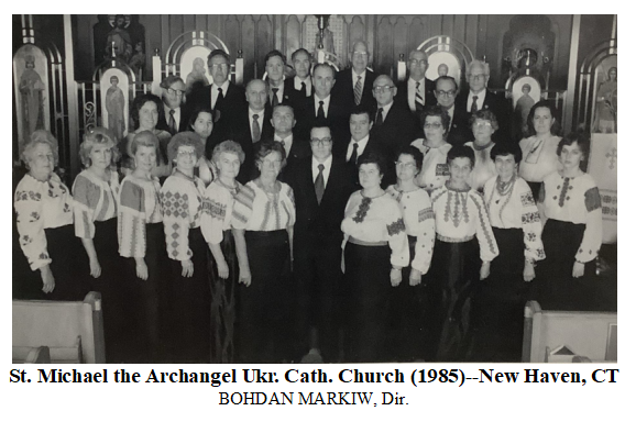 Bohdan Markiw [Богдан Марків], (born: October 7, 1928, in Wolsztyn, Poland) conductor, violinist, and music teacher. He was born in Poland and grew up in Ternopil, Ukraine. He left Ukraine during WWII and lived at the DP camp in Berchtesgaden, Germany, from 1946 to 1949. After studying music in Germany and Spain, he immigrated to America in 1957, where he taught music and played the violin in various orchestras in the Connecticut area. As director of the choir at St. Michael the Archangel Ukrainian Catholic Church in New Haven, he added much new music to the choir’s repertoire, including the entire Mass by Ivan Nedilsky.