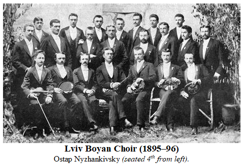 Rev. Ostap Nyzhankivsky [Остап Нижанківський], (b. January 24, 1862, in Mali Didushych, Lviv, Ukraine; d. May 22, 1919, in Stryi, Lviv, Ukraine). Composer, conductor, and Greek-Catholic priest from Western Ukraine. Nyzhankivsky was born in 1862 near Lviv in the village of Mali Didushych. He finished Theological Seminary in Lviv and was ordained a Greek-Catholic priest in 1892. After his graduation from the Prague Conservatory of Music, and he dedicated much of his energy to developing musical life in Halychyna. In 1885, he founded the musical publishing house “Musical Library” [«Музикальна Бібліотека»]. He organized choral concert tours throughout the region and established Boyan singing societies in several cities, including Berezhany (1892), Lviv (1895-1896), and Stryi (1900–1914).