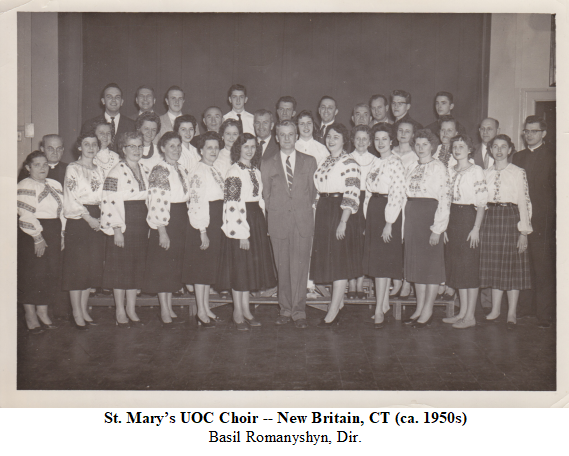 Basil Romanyshyn [Василь Романишин], (b: Oct. 14, 1915, in Allentown, PA; d: Dec. 28, 2016, in New Britain, CT). Choir director for 50 years at St. Mary’s Ukrainian Orthodox Church in New Britain, Connecticut. He was born in 1915 to Ukrainian parents who were residing at the time in Allentown, Pennsylvania. The family moved back to Ukraine where Basil received training in church singing at a young age. He worked there as a choir director until 1933 and then moved back to the United States to become the choir director at St. Mary’s Church. After serving in the U.S. Army during the Second World War, he returned to New Britain to continue in his position as director of the choir.