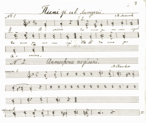 Peter Shawinsky [Петро Шaвинський], (b: 1882 in the Western Ukrainian village of Ruda, Львівської області; d: ca. 1960s), cantor and choir director at SS. Peter and Paul Ukrainian Catholic Church in Jersey City, New Jersey. He came to America in 1908 and settled in Jersey City, where he served as the cantor-teacher at SS. Peter and Paul throughout the 1920s. He moved to Stamford, Connecticut, around 1929 and became the choir director for the parish of St. Vladimir UCC. He stayed there until sometime in the 1950s, when he was replaced by director Peter Koczanki.
